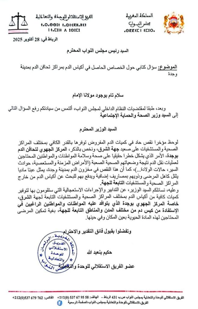 الصفحة الرئيسية » Blog » النائب البرلماني حكيم بن عبد الله يوجّه سؤالًا كتابيًا إلى وزير الصحة بشأن الخصاص الحاد في أكياس الدم بوجدة