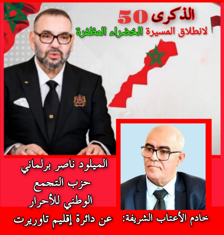 بمناسبة تخليد الشعب المغربي قاطبة للذكرى الخمسين لانطلاق المسيرة الخضراء المظفرة، التي تتزامن هذه السنة مع اعتماد القرار الأممي الصادر عن مجلس الأمن بشأن الصحراء المغربية، والذي يجدد تأكيد دعم المجتمع الدولي لمبادرة الحكم الذاتي تحت السيادة المغربية، يتشرف السيد الميلود ناصر،برلماني حزب التجمع الوطني للأحرار عن دائرة إقليم تاوريرت، بأن يرفع إلى المقام السامي لصاحب الجلالة الملك محمد السادس نصره الله وأيده، أسمى آيات التهاني والتبريك، مشفوعة بخالص معاني الولاء والإخلاص.